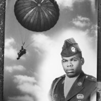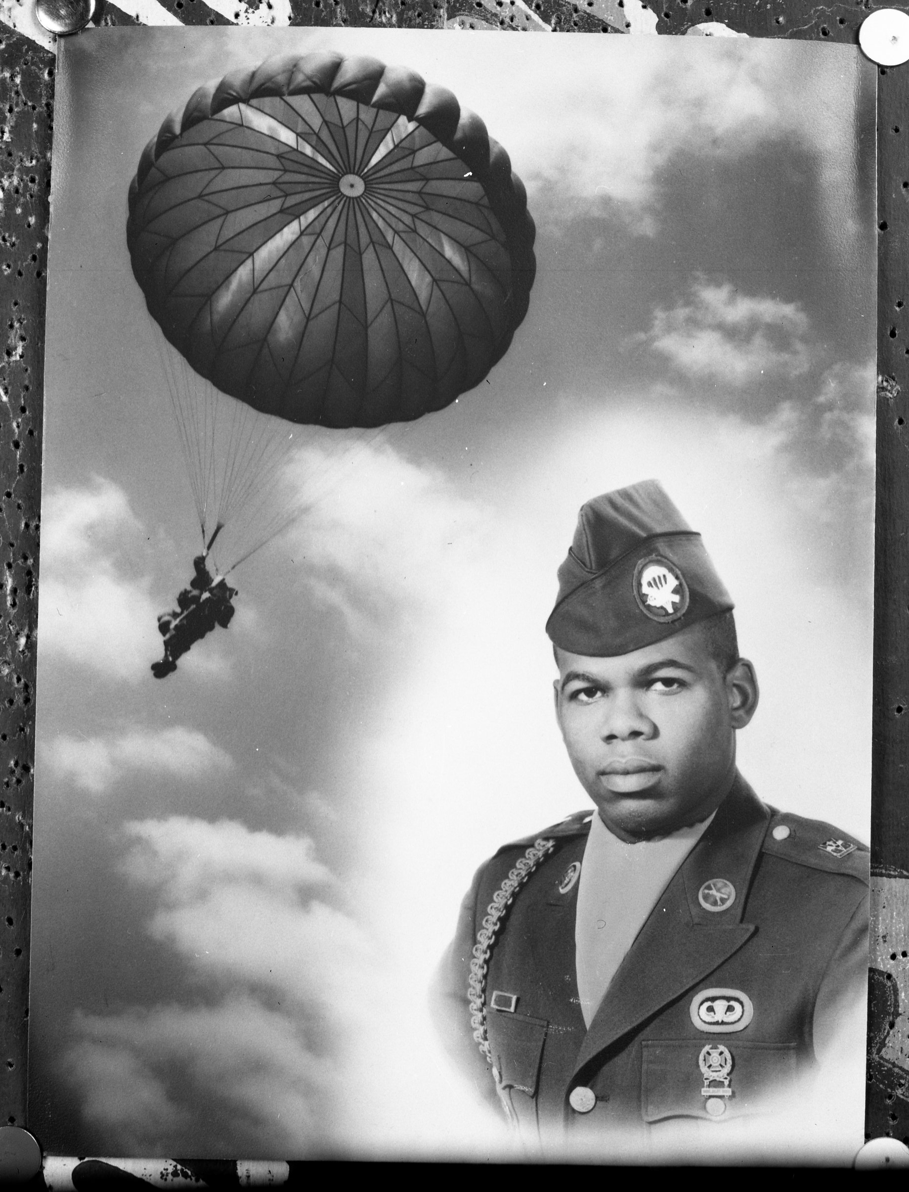 Army Airborne Ranger posing in uniform, with parachute in background.