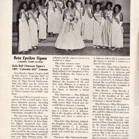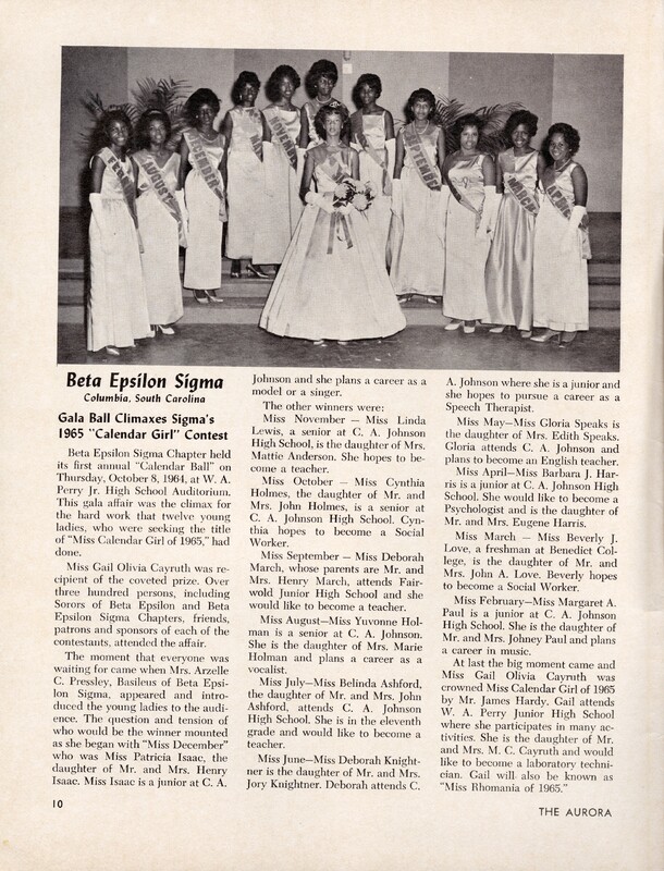 Magazine article from The Aurora featuring the Beta Epsilon Sigma Chapter of Sigma Gamma Rho Sorority’s 1965 “Calendar Girl” contest and annual Calendar Ball held in Columbia, South Carolina. The article includes a group photograph of the student contestants representing the months of the year and identifies Gail Olivia Cayruth as the 1965 Calendar Girl winner.