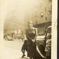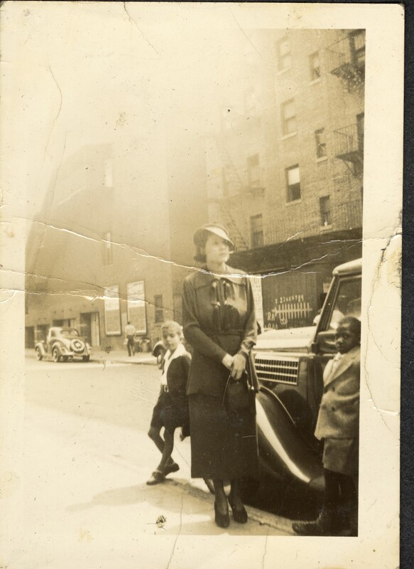 Images such as this offer glimpses of everyday life during the early twentieth century, documenting fashion, family relationships, and the growing presence of automobiles in city environments. The photograph comes from the Williams family scrapbook and reflects the kinds of informal snapshots families preserved to record daily experiences and community life.