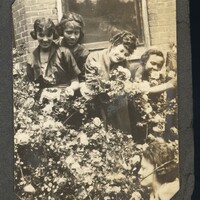 Sepia-toned photograph of a group of young women gathered around a flowering bush, smiling and smelling the blossoms. The women lean over the flowers and appear relaxed and playful, suggesting a candid moment captured outdoors beside a brick building. Their hairstyles and clothing—loose dresses, jackets, and waved or bobbed hair—reflect early twentieth-century fashion.