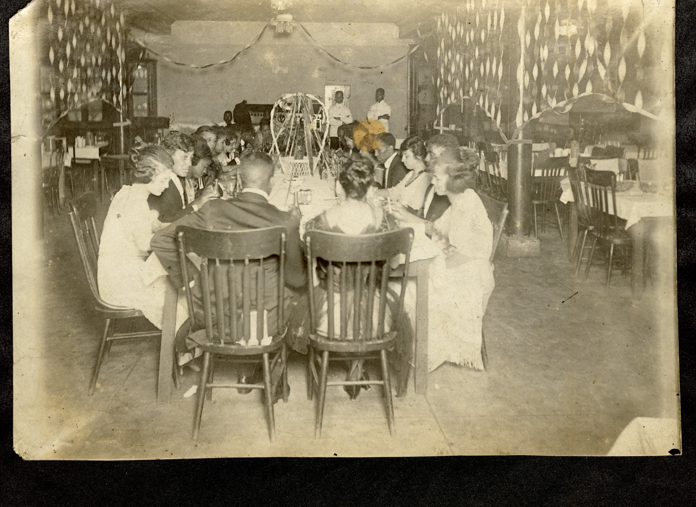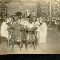 Black-and-white photograph showing a group of men and women seated together at a long dining table during a social gathering, dating to approximately 1919–1922. The individuals are dressed in formal attire typical of the early twentieth century, suggesting a special occasion such as a banquet, club meeting, or celebratory event. The table is decorated with a tall centerpiece, and the room is adorned with streamers and other festive decorations.