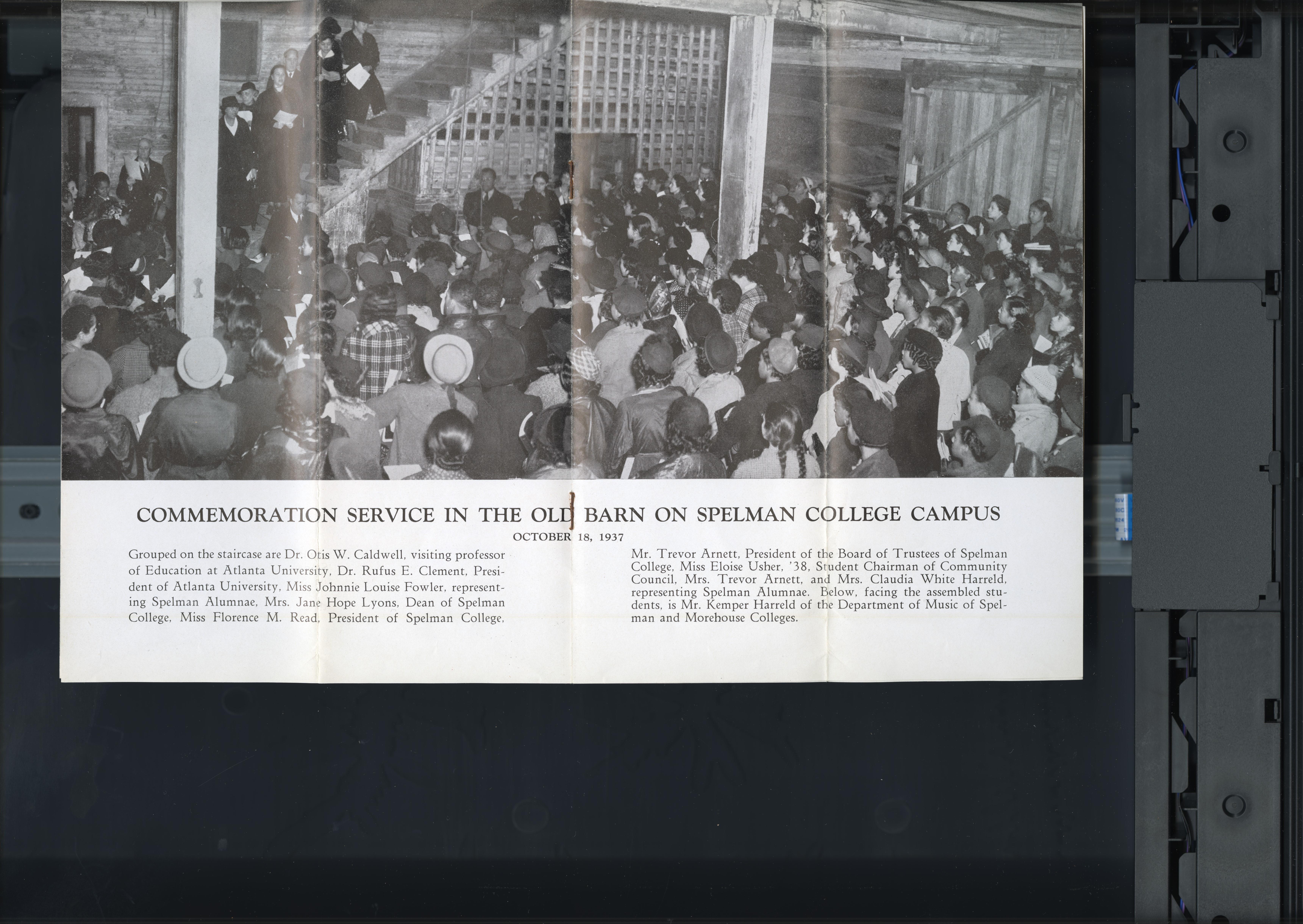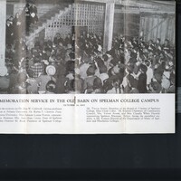 Magazine spread featuring a photograph of students gathered in the Old Barn on the campus of Spelman College during a commemorative service held on October 18, 1937. The image shows a large assembly of students seated closely together while speakers stand on a staircase addressing the crowd. The event reflects the traditions of campus gatherings and commemorations that brought together students, faculty, and visiting leaders.