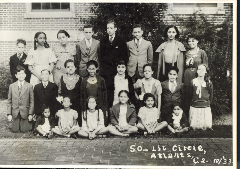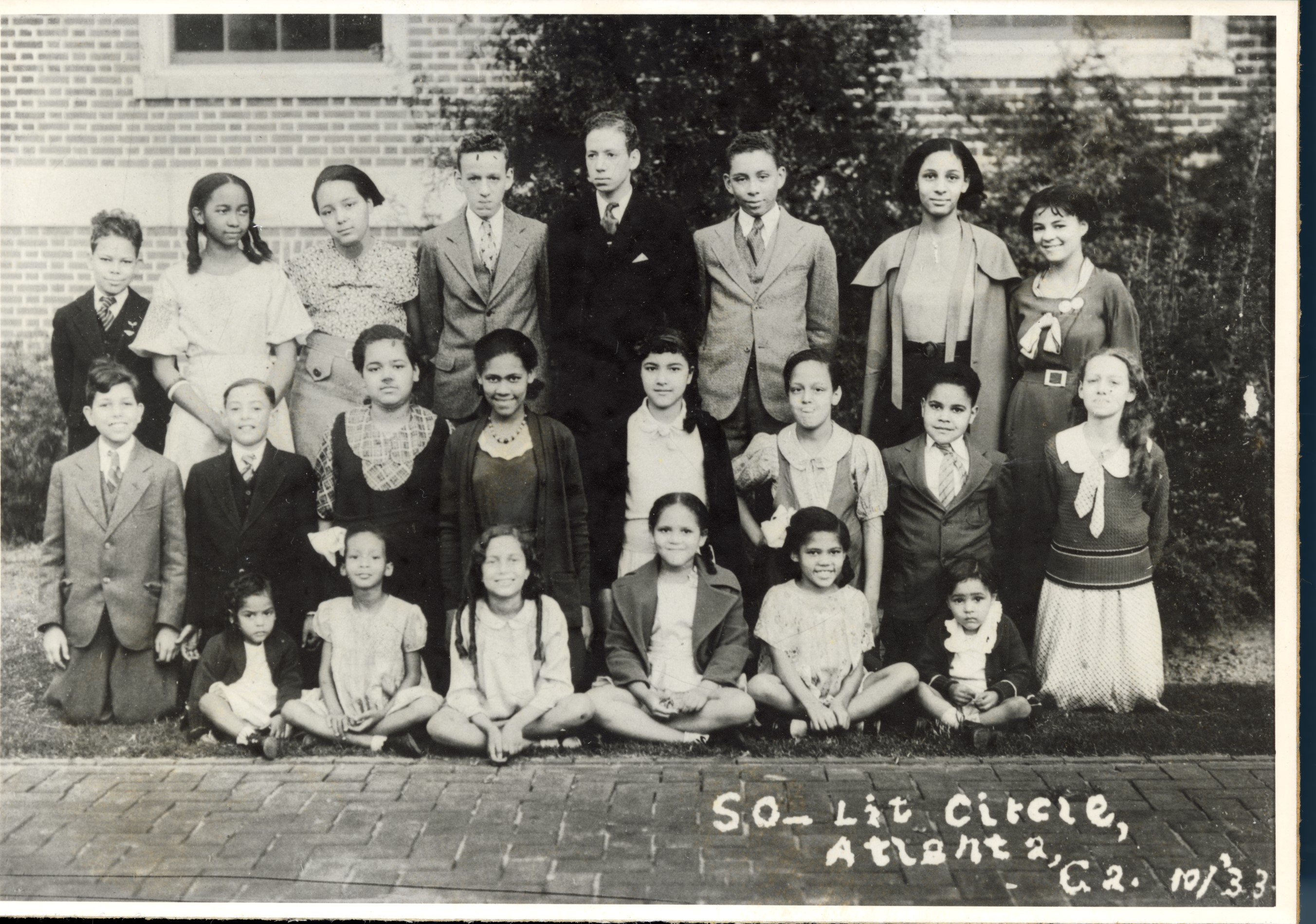 Group photograph of members of the Soc-Lit (Social–Literary) Circle in Atlanta, Georgia, dated October 1933. The image shows a large group of children and adolescents arranged in three rows outdoors in front of a brick building. The group includes boys and girls dressed in formal or semi-formal clothing typical of the early 1930s, including suits, dresses, and hair bows.