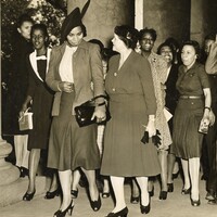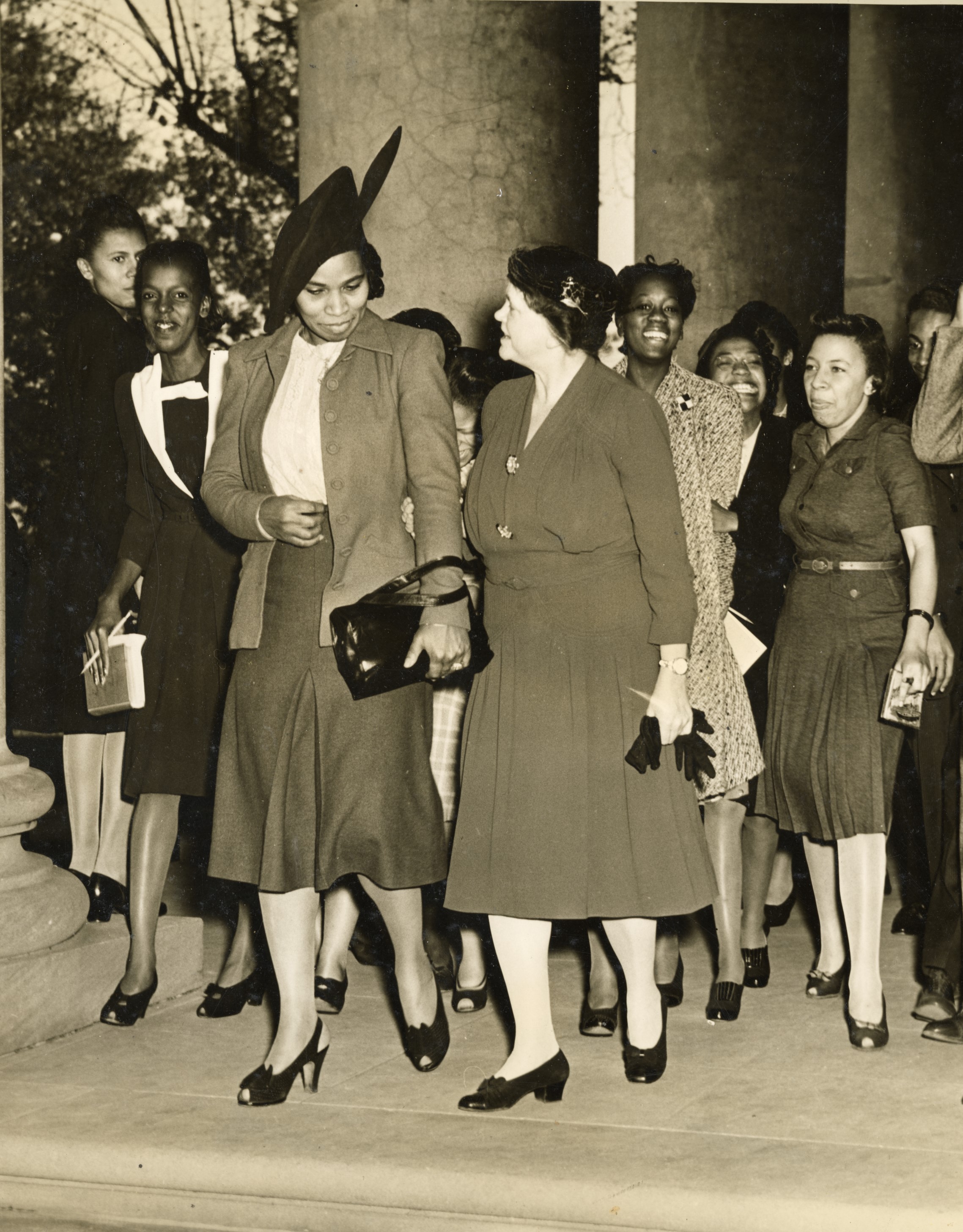 Photograph of Marian Anderson visiting Spelman College, circa 1940s. Anderson is shown walking with a group of women, dressed in formal attire, as they descend the steps of a campus building. The image captures a moment of community gathering and highlights Anderson’s presence at a historically Black women’s college during the height of her celebrated career.