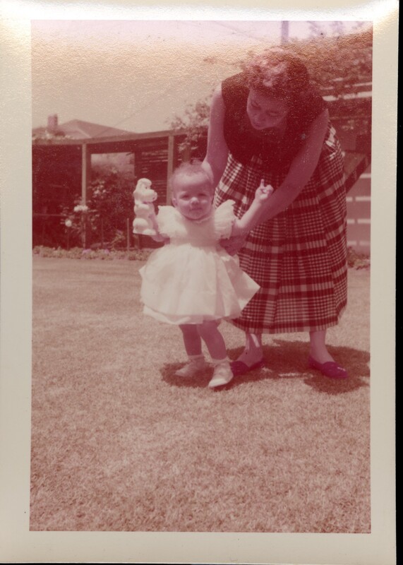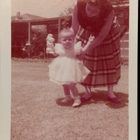 Color photograph of Rheba Butler and her daughter, Darrilyn Selena Butler (granddaughter of Selena Sloan Butler), taken in June 1956. The child, dressed in a light-colored dress, holds a toy poodle while being supported by her mother outdoors on a lawn, capturing a tender family moment.