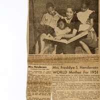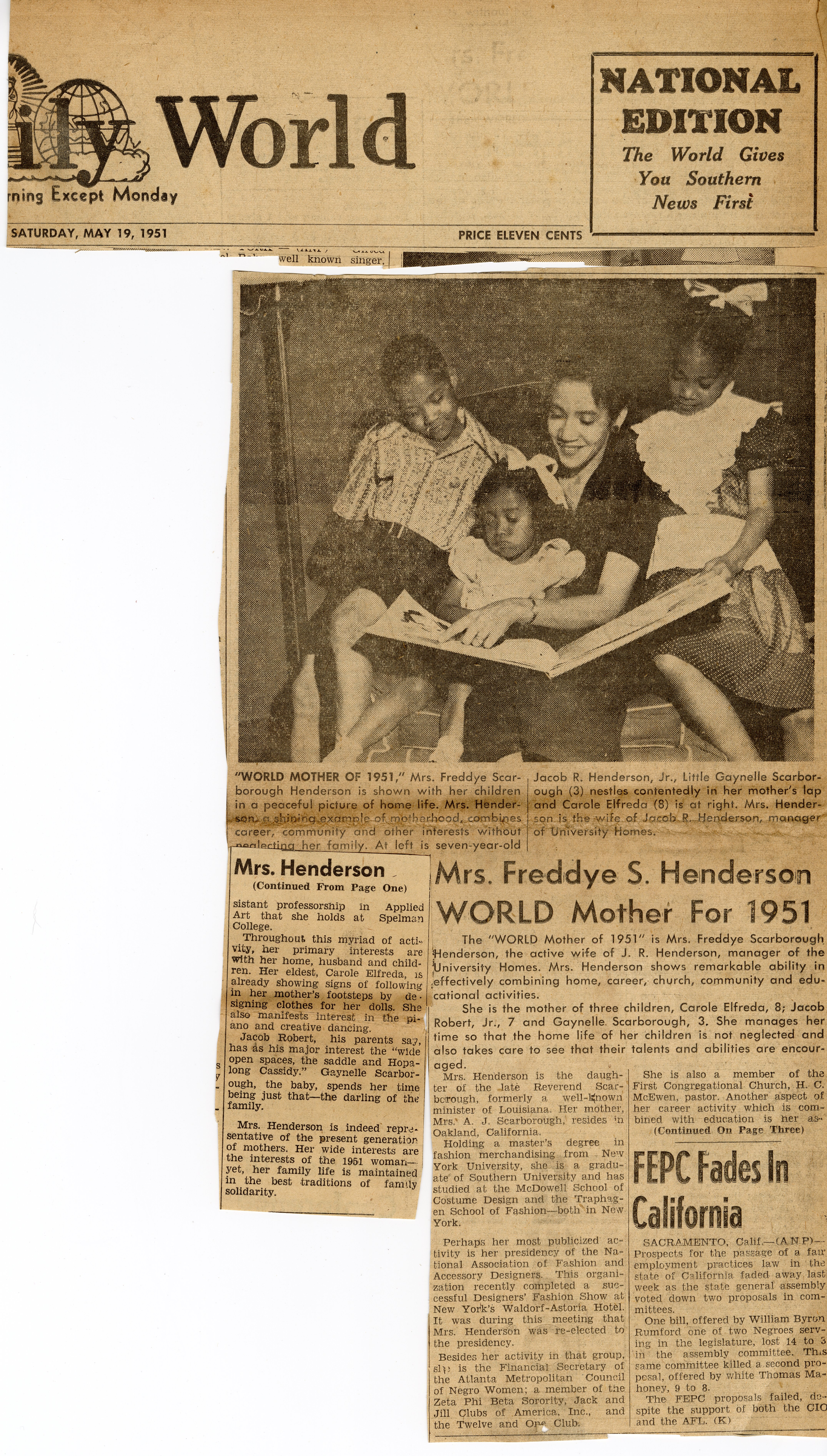 Newspaper Clipping of the Atlanta Daily World May 19, 1951, where Freddye Henderson is named 1951 World Mother. Features a picture of Freddye reading a book to her children, seven-year-old Jake Jr., three-year-old Gaynelle Scarborough, and eight-year-old Carole Elfreda.
