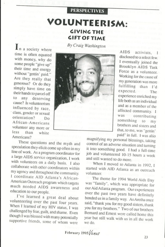 “Volunteerism: Giving the Gift of Time” — Article by Craig Washington (Venus Magazine, February 1995)