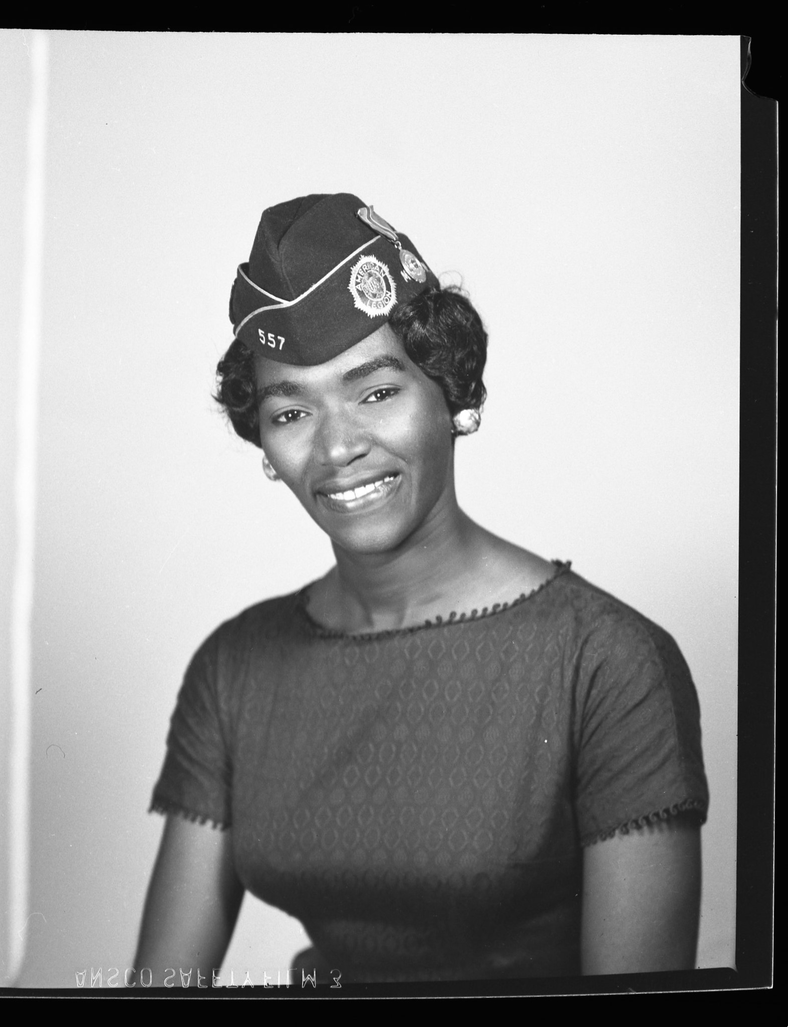 - Woman posing in American Legion cap.