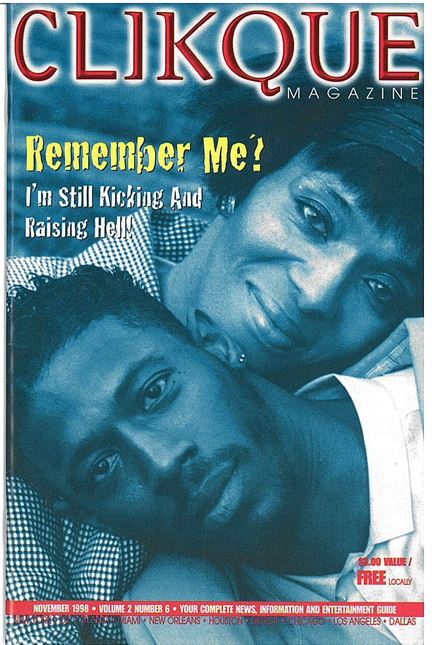 Cover of CLiKQUE Magazine, Volume 2, Number 6 (November 1998), featuring a photograph of two men and the headline “Remember Me? I’m Still Kicking and Raising Hell.” The publication served as a news and entertainment magazine for Black LGBTQ+ communities.