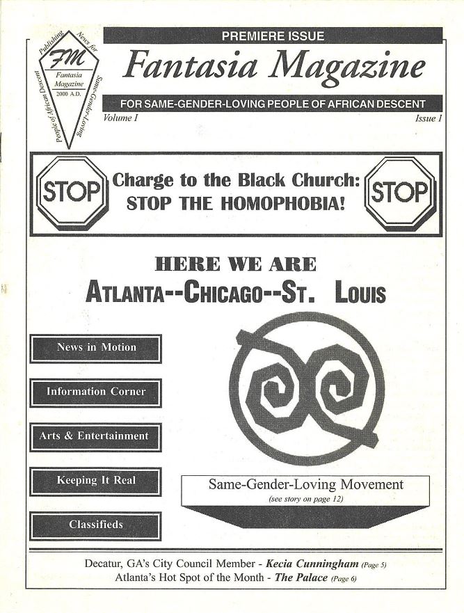 Cover of the premiere issue of Fantasia Magazine, a publication created for same-gender-loving people of African descent. The issue features commentary addressing homophobia in the Black church and includes news, arts, and community reporting.