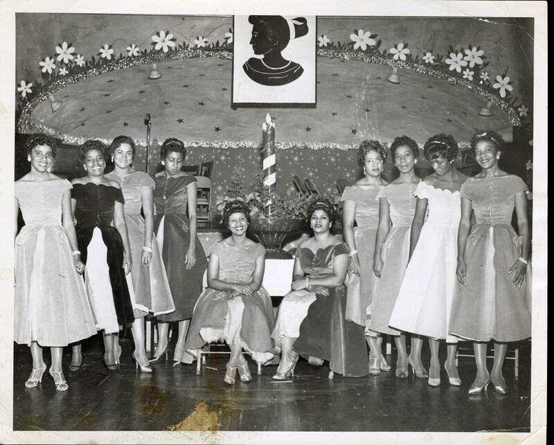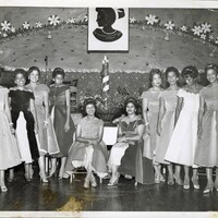 - Black-and-white photograph of a group of young women in formal gowns posing on stage during a Christmas pageant, likely held in a church or community auditorium, circa mid-1950s. The stage is decorated with a holiday backdrop featuring stars, floral decorations, and a central candle display.