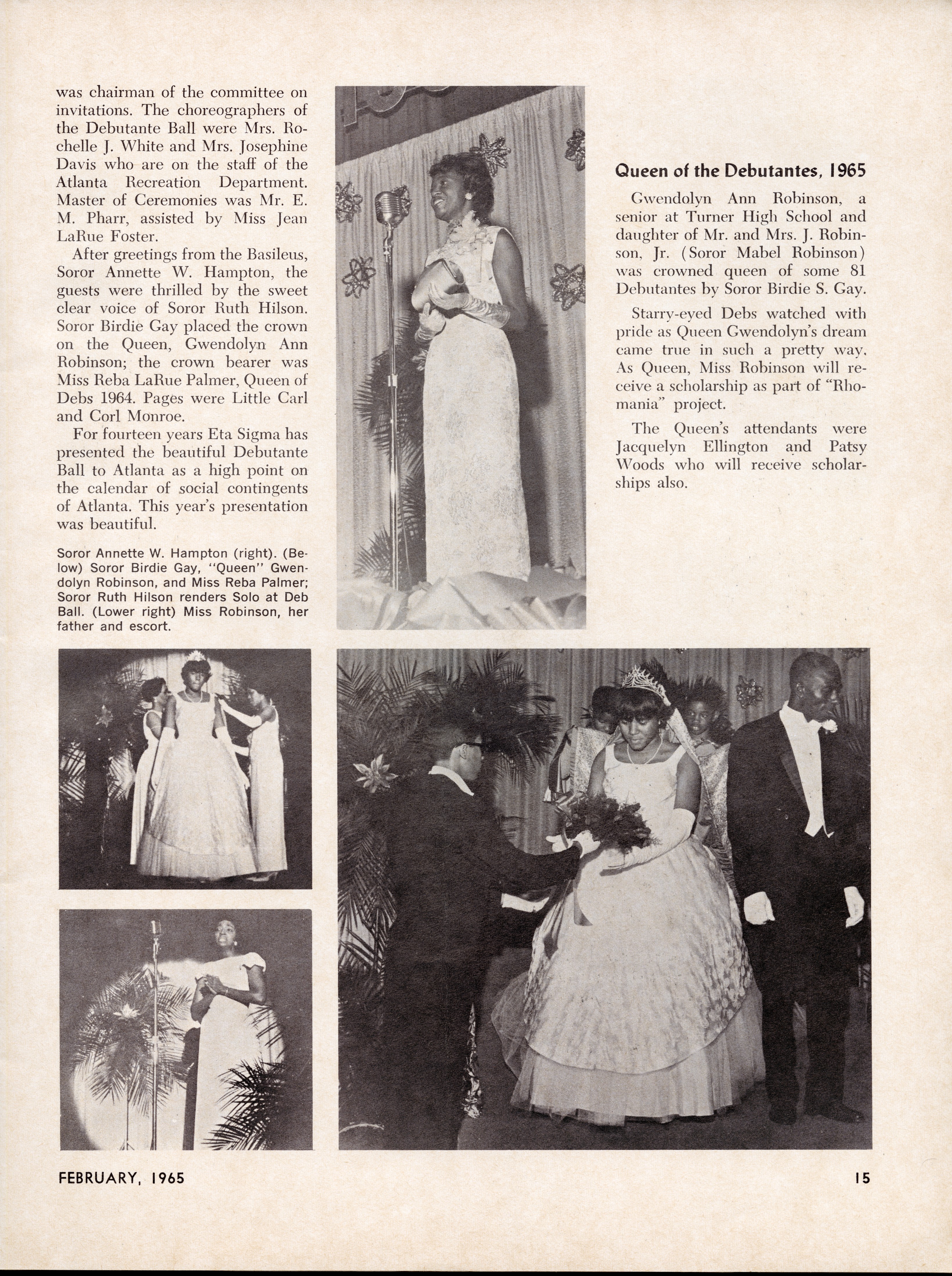 - Magazine article from The Aurora (February 1965) featuring photographs from the Eta Sigma Chapter of Sigma Gamma Rho Sorority’s 1964 debutante ball. The images show the crowning of the “Queen of the Debutantes,” Gwendolyn Ann Robinson, and other young African American women participating in the formal presentation ceremony.