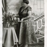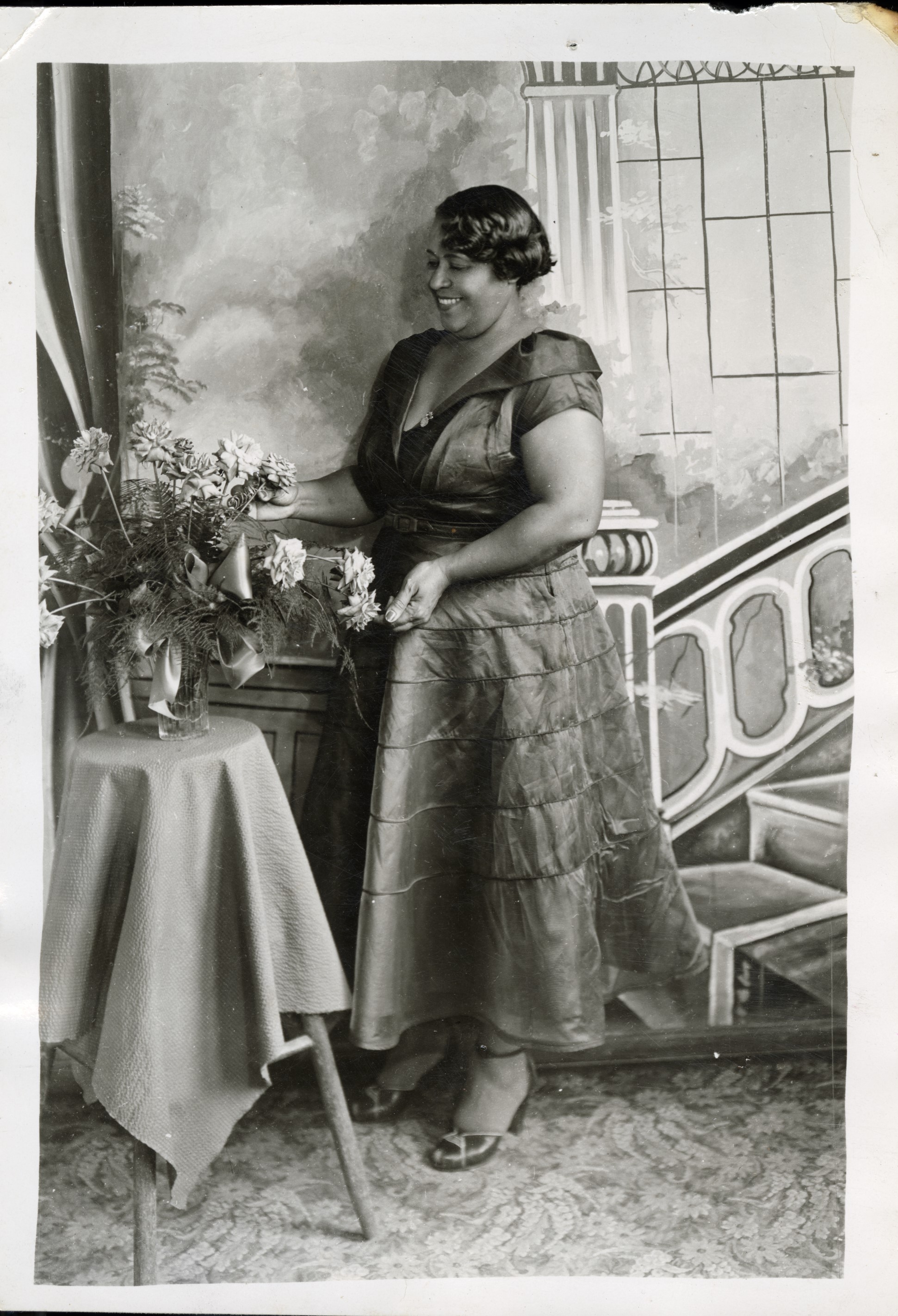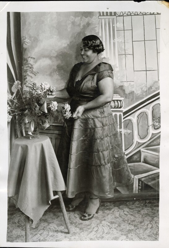 - Studio portrait of Ruby Blackburn taken in the early 1930s. Blackburn stands beside a small table arranging flowers in a vase, wearing a fashionable dress with layered fabric and styled hair typical of the era. The staged studio backdrop and elegant pose highlight the grace, style, and self-presentation of African American women during the early twentieth century.