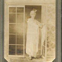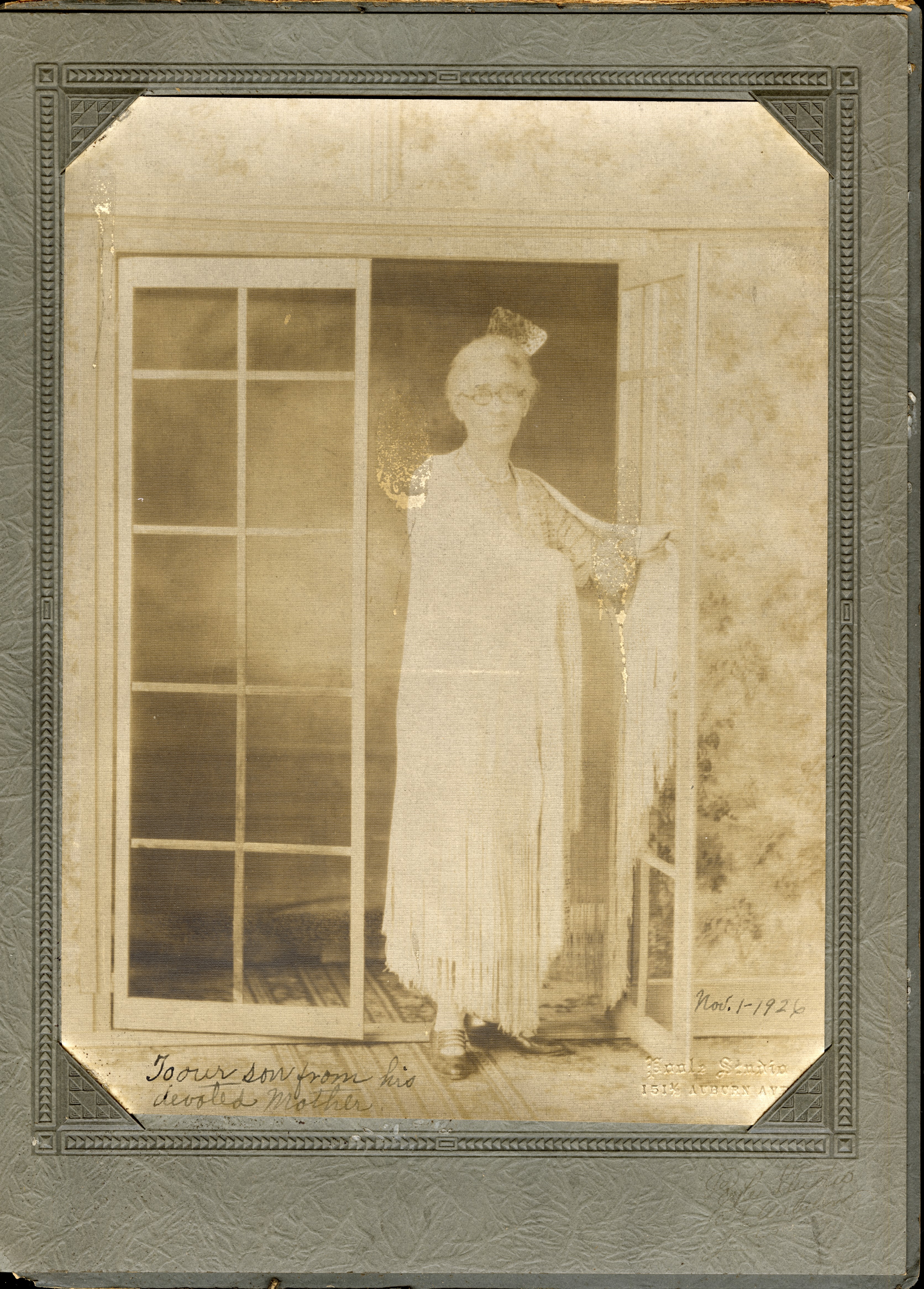 - Sepia studio portrait of an African American woman standing in a doorway wearing a shawl and a fringed dress, photographed in Atlanta in 1926. The inscription on the photograph reads, “To our son from your devoted mother, November 1, 1926.” The woman may be Selena Sloan Butler, though this identification is not confirmed. The portrait reflects the dignity, style, and familial devotion expressed through formal portrait photography in early twentieth-century African American communities.