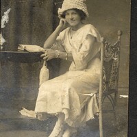 - Studio portrait of an African American woman seated beside a small table, photographed between approximately 1912 and 1916. She rests her head lightly on her hand while an open book sits on the table beside her, suggesting a quiet moment of reading or reflection. The woman wears a light-colored dress, lace gloves, and a textured cloche-style hat adorned with a flower. A delicate handbag hangs from her wrist. Her composed posture and fashionable attire reflect the grace, intellect, and self-presentation of African American women in the early twentieth century.