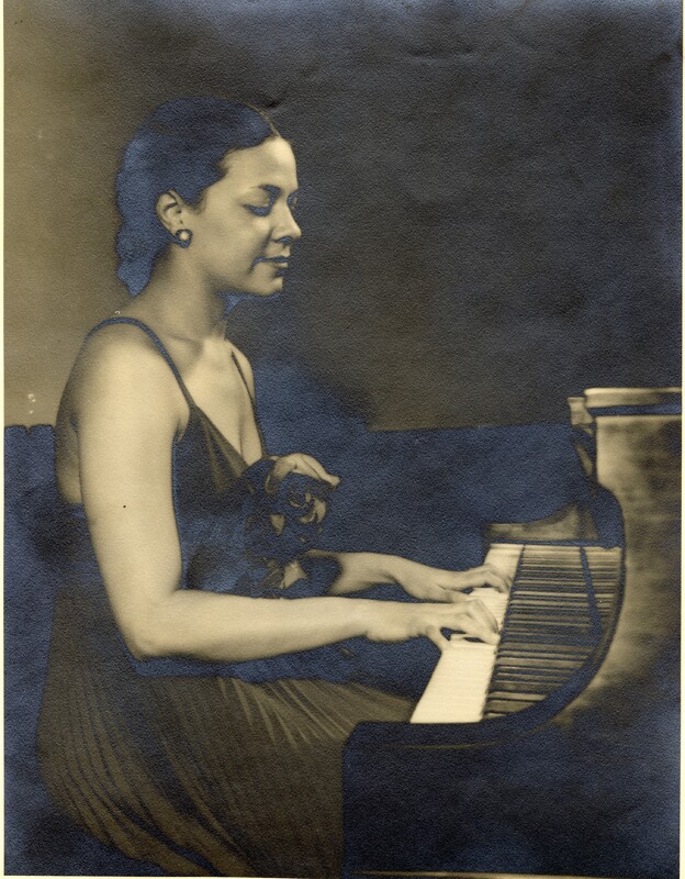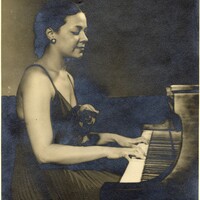 - Black-and-white portrait of an African American woman seated at a piano, photographed around 1943. The woman is shown in profile, her hands poised on the keys as she plays. She wears a sleeveless dress and small earrings, her hair styled neatly back from her face. The photograph captures a quiet moment of concentration and artistry, highlighting the role of music, cultural expression, and refinement in African American life during the mid-twentieth century.