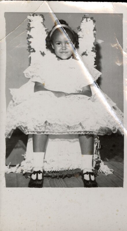 - Portrait of a young African American girl seated on a decorated chair, photographed around the 1950s. The child is dressed in a frilly formal dress with lace trim, white socks, and Mary Jane shoes. A headband adorns her hair, and she smiles gently toward the camera. The carefully arranged outfit and decorative chair suggest the photograph was taken for a special occasion or formal portrait. The image reflects the pride families took in presenting their children with care, elegance, and celebration during mid-twentieth-century African American family life.