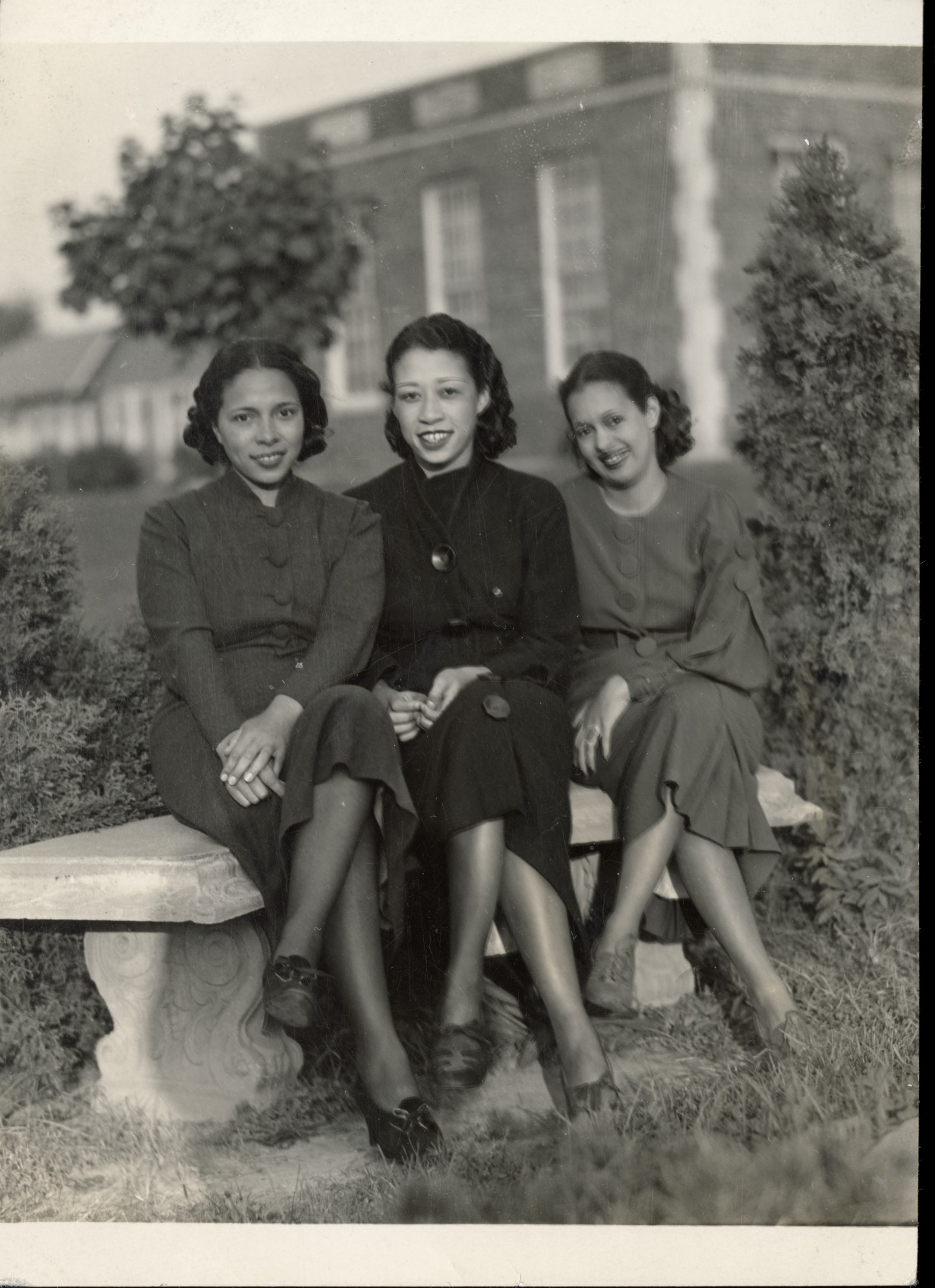 Outdoor portrait of three young African American women seated together on a stone bench in front of a brick school building in 1936. The women are identified as members of the Miss West Virginia court: Eddie Mae Stubbs (left), Dot Bradshaw (center, Miss West Virginia), and Violet Burks (right). They sit close together, smiling toward the camera, dressed in fashionable mid-1930s dresses with softly waved hairstyles typical of the period.
