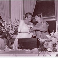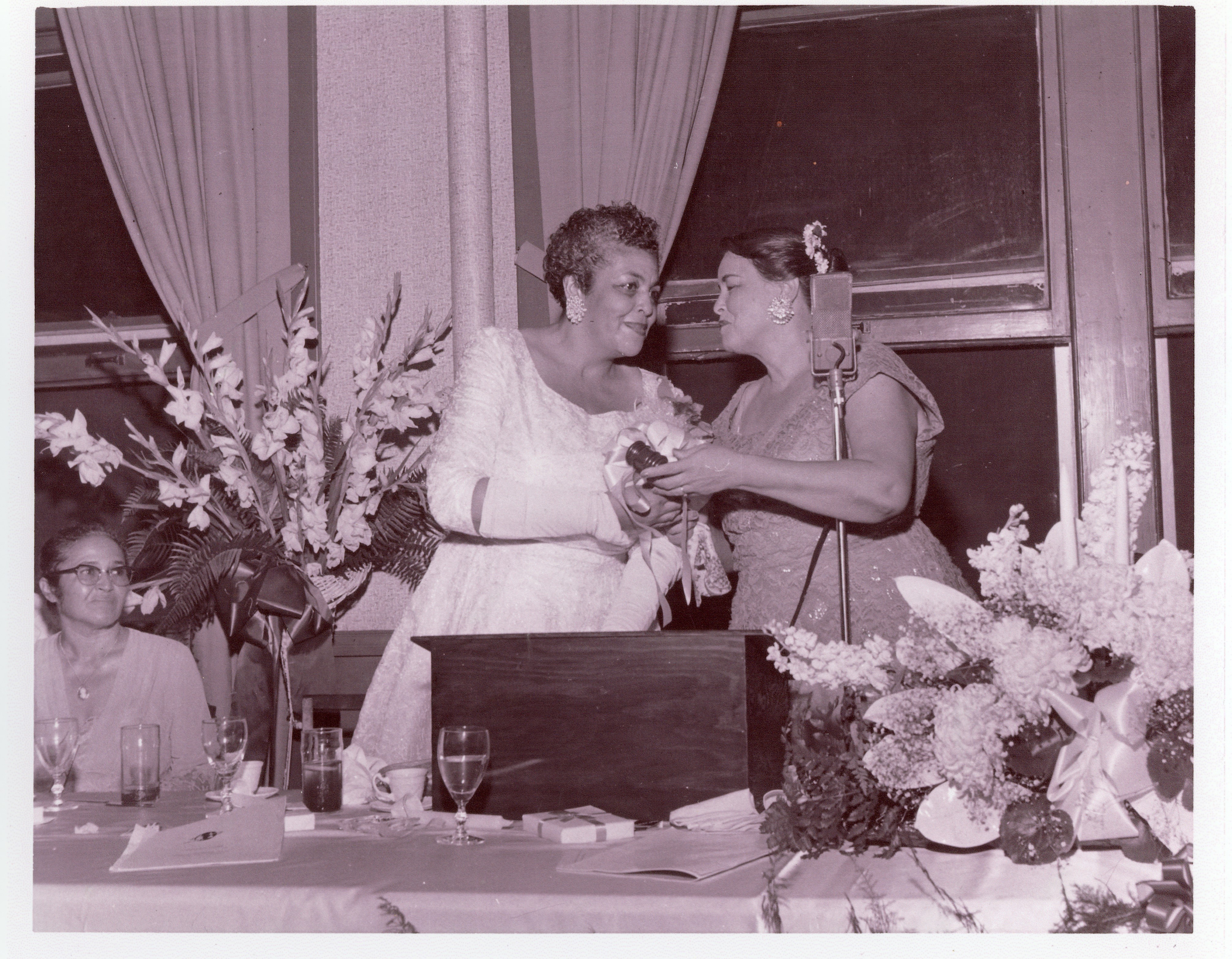 Photograph of two members of The Links, Incorporated, Atlanta Chapter, speaking together at a podium during the Benjamin E. Mays Banquet in the 1950s. The women stand close to a microphone, appearing to exchange remarks or present an award. Floral arrangements and banquet tables are visible in the foreground, while other attendees sit nearby.