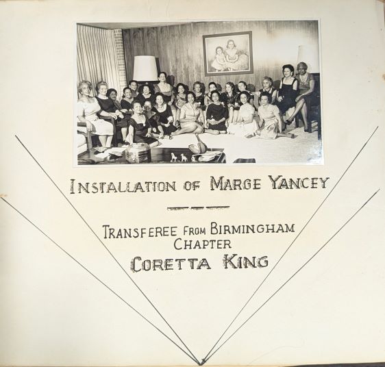 Scrapbook page from the 1961–1962 records of the The Links, Incorporated, Atlanta Chapter, featuring a group photograph of chapter members gathered for a chapter event. The page notes the installation of Marge Yancey and the transfer of Coretta Scott King from the Birmingham chapter to the Atlanta chapter.