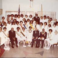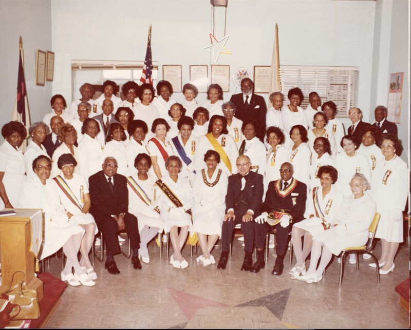 Framed certificates, flags, and a star emblem appear in the background, reinforcing the chapter’s fraternal and ceremonial setting. The photograph documents the social, spiritual, and community-building role that organizations like the Order of the Eastern Star played within African American communities during the twentieth century, providing fellowship, leadership opportunities, and charitable service. - Type